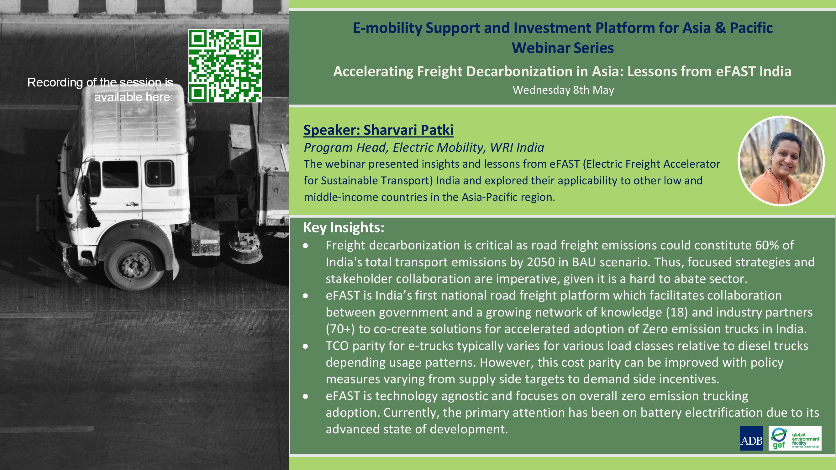 The webinar presented the impactful learnings and experiences from eFAST India, the country’s first national freight platform dedicated to accelerating freight electrification. The session explored the potential of scaling up the platform’s impact to benefit other countries in the region.
